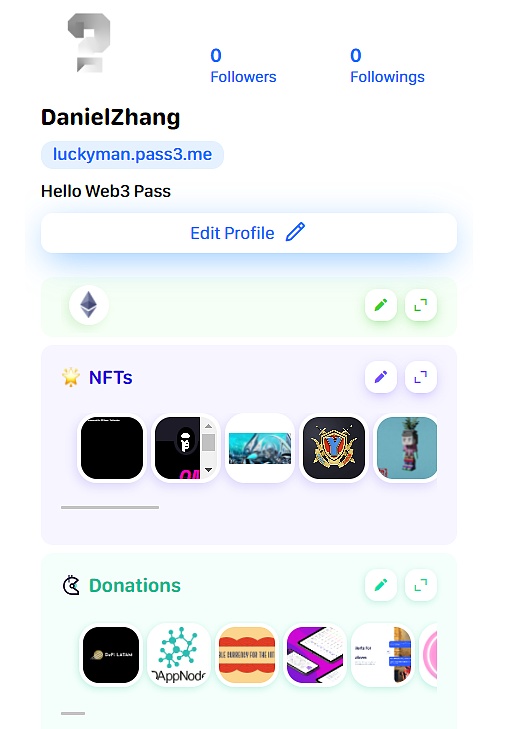 這樣一來,專屬于用戶個人的Web3通行證就構建完成了。用戶可以將其通行證鏈接放在某個顯眼的地方,比如你的Twitter,這樣別人就可以關注你的通行證,并隨時隨地地查看它。