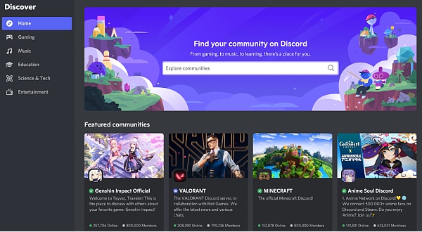 如果想要額外探索其他熱門或者相關的Discord服務器,主頁面的最左下角有Expolre Public Servers(探索公共服務器)的選項,Discord官方會根據熱度以及主題等為用戶推送一些廣受歡迎的服務器。