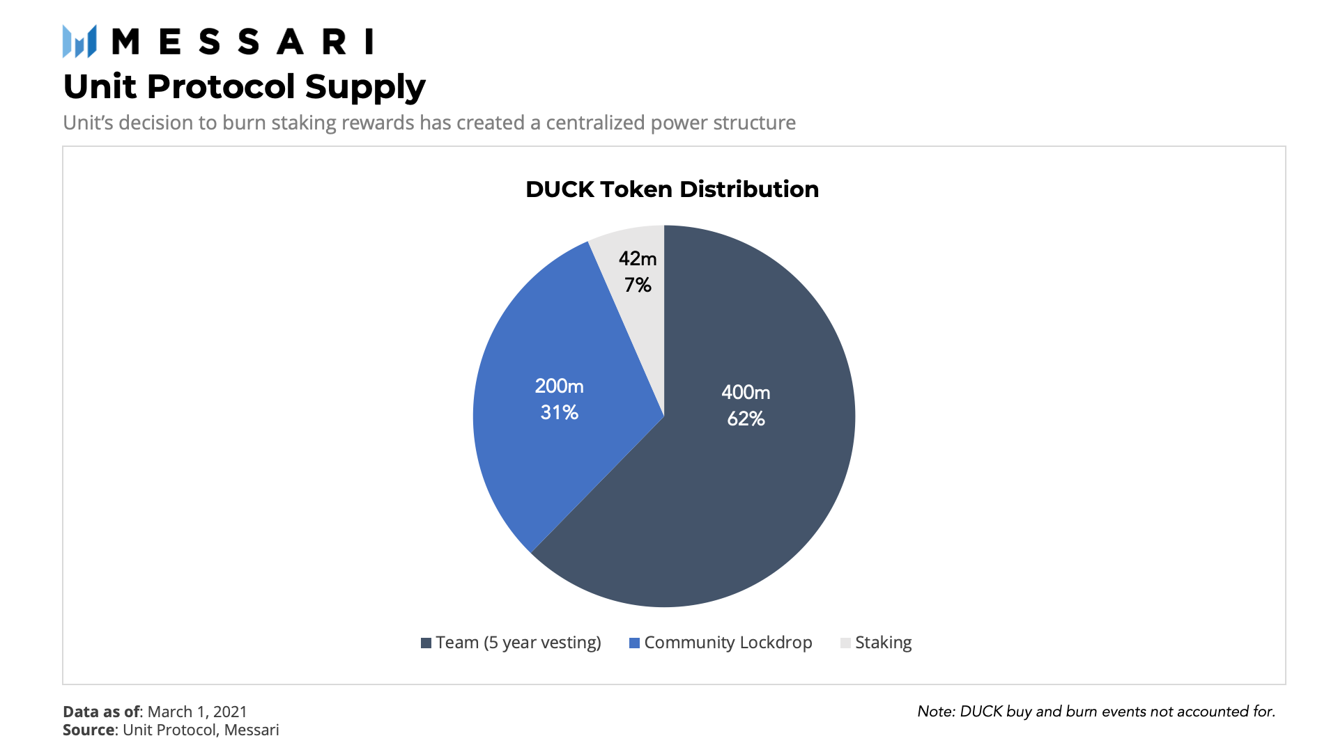 雖然Unit的LCO啟動模式是公平的,但團隊保留了20%的COL供應(5年解鎖),并將剩余的70%分配給未來的質押獎勵,且在不久之后,團隊確確實實地就銷毀了預留的70%的COL。2020年12月,Unit的治理代幣遷移為DUCK,比例為100 COL比1 DUCK。最后,90%的剩余DUCK質押代幣被銷毀。作為所有這些行動的結果,DUCK的最大供應量為6.42億,而該團隊控制了大約62%的DUCK代幣。