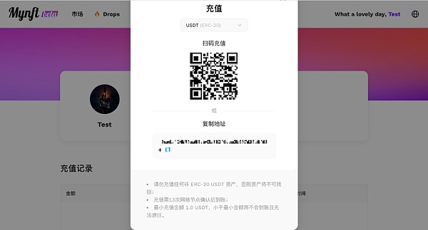如果余額不夠,可以點擊充值,往平臺個人錢包充值以太坊上 ERC-20 格式的 USDT(未來還將支持 Flow 和 FUSD 充值)。