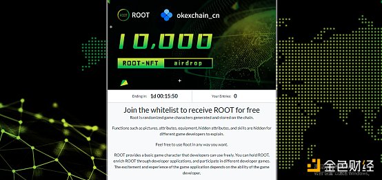 根據官方消息,ROOT NFT的銷售第一階段已在OEC公鏈開啟,將以空投白名單的形式進行。用戶可在官網:https://giv.gg/root-top中參與,報名截止時間:2021.9.8 14:00(UTC+8:00),用戶可通過填寫自己的OEC地址免費獲得ROOT,每個地址最多免費領取1個ROOT,總量10000個。