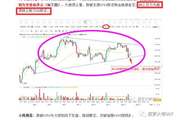 從BTC走勢上看,4小時完全按我們上文所說的三角收斂,主力按著劇本走。現在至上軌壓力線,大餅上漲開始有放緩跡象。
