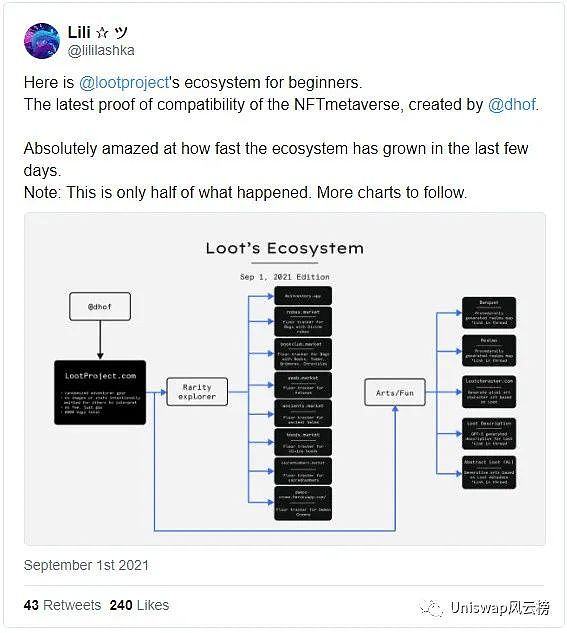然后人們開始向自己的朋友和同事講述 Loot,隨著興趣的飆升,這種“口碑營銷”效果在 NFT 生態系統中像野火一樣蔓延。此外,Loot 的“你可以做任何你想做的事”的口號也一直(并且仍然)廣受歡迎,極大地吸引了所有精通以太坊的 Web3 夢想家,這一現實肯定會影響到該項目的快速提升,更推動了去中心化世界里許多建設工作。