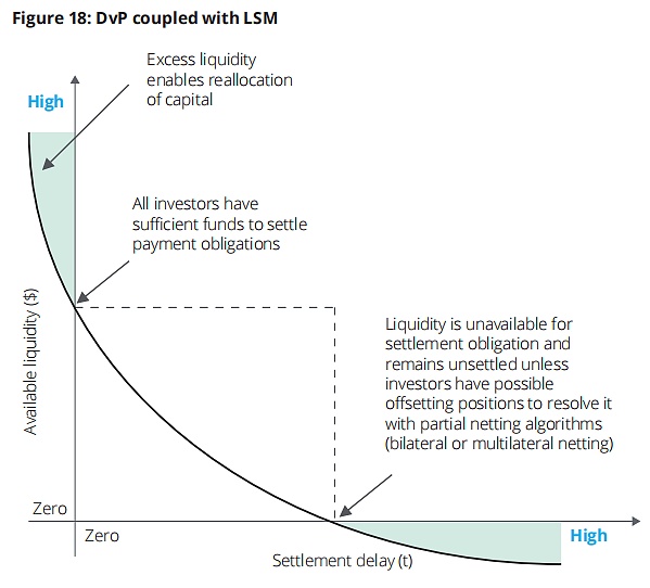 關于流動性儲蓄機制(LSM),耦合的DvP和LSM系統可能給流動性管理帶來潛在的好處,并有助于減少市場參與者所經歷的結算延遲量(見圖18)。T+3的結算期為參與者提供緩沖,以確保基礎資產進行結算。隨著參與者的流動性較低,結算延遲增加,導致潛在的未結算的貿易義務,只能通過抵消頭寸或額外注入流動性來解決。在這種情況下,LSM與 DvP-on-DLT相結合,可以通過確保流動性效率最大化和重新分配過剩的流動性,潛在地緩解這一問題。結算周期的壓縮也可能導致新的流動性管理策略,因為銀行可以利用LSM來實現更好的貿易結算和執行方面的流動性和靈活性。