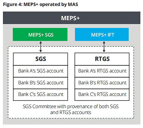 MEPS+是一個由MAS實現和運營的RTGS系統,包括兩個子系統:MEPS+-SGS 和 MEPS+-IFT 。前者基于DvP處理MAS發行的SGS的無票據結算,而后者支持高價值新加坡元(SGD)計價的銀行間資金轉移。市場參與者必須在中央銀行和RMO注冊,在這種情況下,必須注冊為MAS,然后他們才能進行交易(見圖 4)。MAS的SGS市場委員會也有作為仲裁員解決爭議的來源。