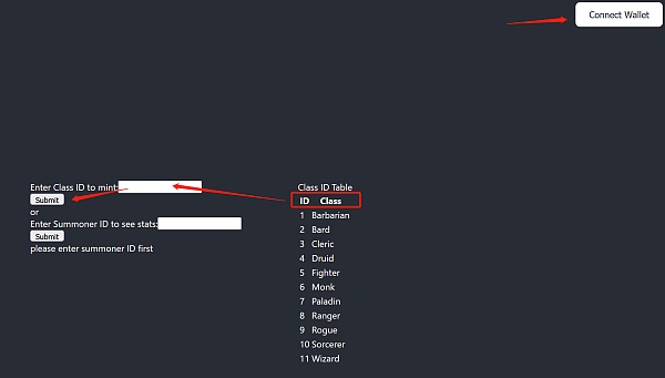目前各職業的屬性暫不清楚,可以根據喜好選一個職業,輸入到Class ID框內,點擊[Submit]進行MINT,按提示確認交易即可。