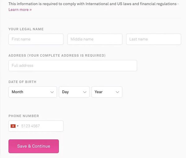 步驟十:依次輸入本人證件上的法定“名”(可用拼音替代)、“中間名”(沒有可不填)、“姓”(可用拼音替代)、“具體地址”、生日的“月”、“日”、“年”、“手機號碼”,填好后點擊Save & Continue。