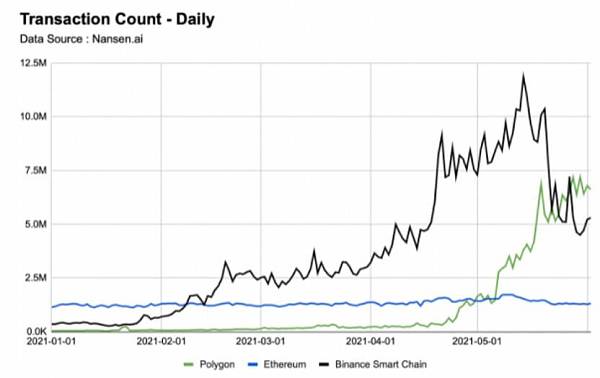另一方面,以太坊的這些問題也給了幣安智能鏈(Binance Smart Chain)大放異彩的機會,幣安智能鏈網絡交易量已經從此前每天不到 100 萬筆增長到高峰期時的 1100 萬筆。雖然 Polygon 的增長速度相比之下曾經很慢,但更加穩定且有機。