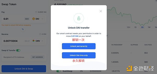3.如果想要將除了 ETH 之外的代幣交易成其他代幣,需要首先[Unlock]以批準協議對所選資產的訪問,在解鎖時,可以選擇解鎖一次,或永久解鎖