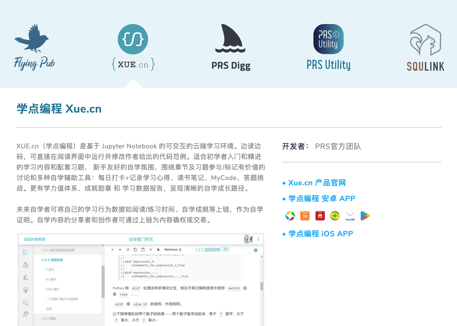 另外,官網披露了5款Dapp,分別是:分布式輕型寫作工具及內容聚合服務飛帖?(Flying Pub)、學點編程?XUE.cn、頂瓜瓜PRSDigg閱讀平臺、PRS Utility錢包、和一項基于區塊鏈正在開發中的內容分享服SQUlink。