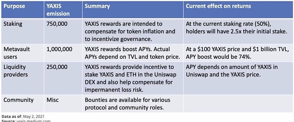 大多數新協議都會為AMM的流動性提供補貼,這些AMM會在啟動后的短時間內交易該協議的代幣。yAxis已在Uniswap上激勵了此類LP。截至5月1日,代幣對池子共有146,245個YAXIS代幣與2159個ETH,為新進入者以及在收獲時需要向YAXIS質押者支付收益費的代幣購買提供了YAXIS來源。
