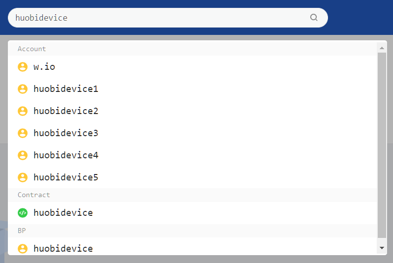 通過EOSpark瀏覽器的搜索,w.io賬戶中有向名為huobidevice2的賬戶進行了大資金轉賬,而再次查閱huobidevice相關的賬戶,其中存在從1到5為順序的多個huobidevice賬戶。