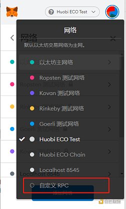 1.需要用MetaMask錢包(就是小狐貍錢包),配置下火幣生態鏈,如下圖,點擊選擇“自定義PRC”。