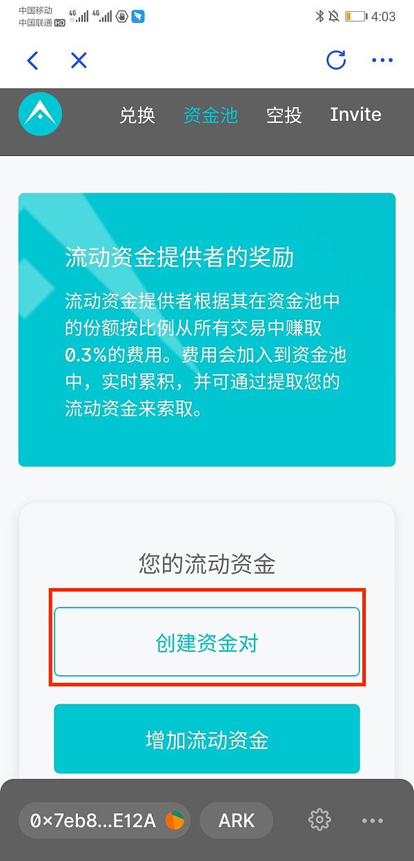 ArkSwap已開啟流動性挖礦,用戶可根據提示自行創造新的流動性池: