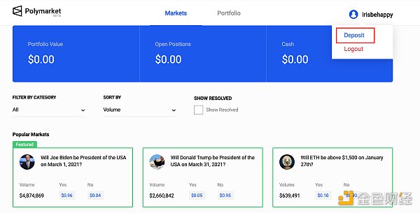 2.選擇右上角用戶名,點擊[Deposit]向平臺轉入 UDSC ,轉入方式有三種:1)調用 Metamask 錢包轉入 2)直接向特定地址轉賬 3)使用信用卡購買USDC