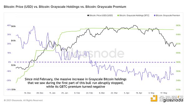 2021年第一季度的其他幾個指標見證了環境的變換。例如,基于機構需求的灰度比特幣信托的比特幣持有量在2021年2月停止增加(圖 10),而其股票GBTC的溢價實際上變成了負值。