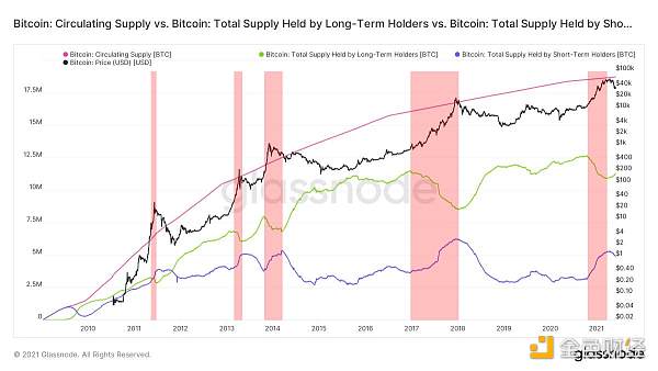 圖3:比特幣價格(黑色)和總量(藍色)、長期持有者(綠色)和短期持有者持有的比特幣(粉色)?