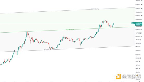 BTC2017年的牛市走勢,研究可以發現這一輪牛市和之前13年牛市走勢類似,前期一路拉升,年中迎來了一波大幅度調整,調整極限位置也剛好位于0.5趨勢支撐線附近,后續走勢如圖中所示,強勢洗盤籌碼充分換手后,BTC反身向上快速拉升繼續牛市新高走勢,在牛市最后的瘋狂期,價格也是攀升至1位置附近,所以這一輪整體走勢和13年基本相似。