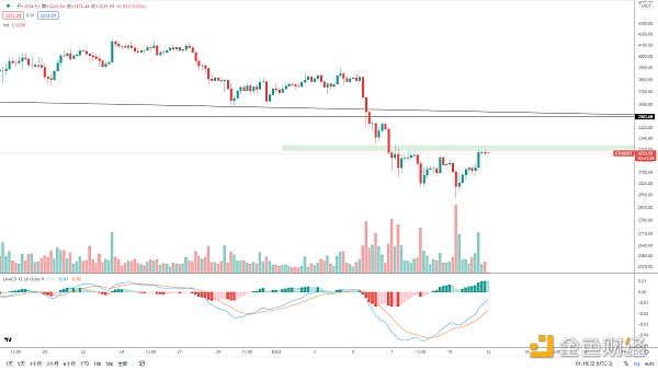 4小時暫時在第一阻力區3250-3300受阻,調整量能有限,預計整理后繼續向上概率大,主要壓力在3450-3550美金,前期3000下方低吸的可以考慮高拋,近期走勢屬于周線破位在回抽的狀態,反彈后有再次探底的可能。