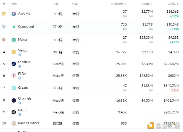 鎖倉量排名前十的借貸平臺 排名來源:DeFibox