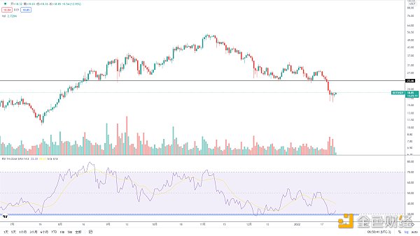 DOT前期跌破標準平橫線23.4美金支撐迎來加速下跌,最低跌至16美金附近企穩反彈,這一帶已經觸及下方超賣支撐線,歷史上已有多次觸底反彈,不過短線反彈后可能再次探底,近期壓力20美金,短線可以高拋,后面開新月線一樣有反彈修復的需求,所以再次探底后將有可能走出一波單邊上漲行情,有可能將再次回測23.4平衡線,支撐16美金。