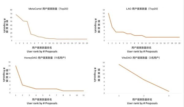 DAO 的治理也表現出參與行為方面的高度傾斜。提案通常由少數參與者提出,其衰減模式與 Discord 活躍度所顯示出的衰減模式相似。