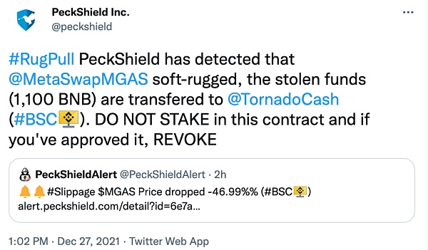 XRP/HKD-2.02%今天圈內的頭條消息:BSC鏈上又多一個爆雷項目——MetaSwap跑路。