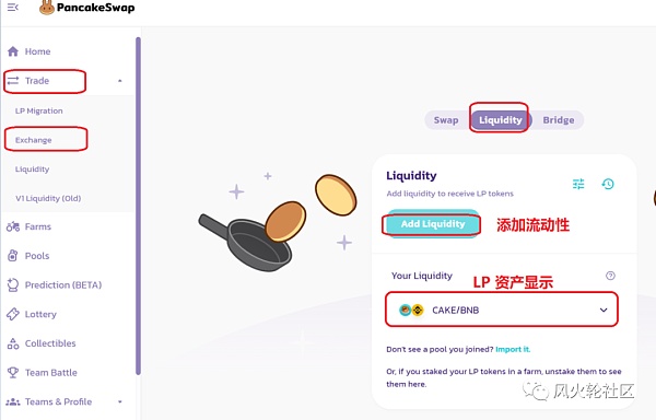 下一步就是添加流動性,也就是把你等值的bnb和cake放進資金池做市,相應的給你一個LP token權益證明,證明你有提供這部分做市資金,這塊平臺也是有引導的,跟新手再說下,如果要增加刪除流動性,也可以在平臺左側交易欄找exchange中的liquidity。