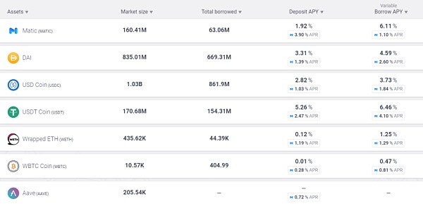 上面的圖表中列出的是通過AAVE協議在Polygon上可參與的7個最大的借貸池,獎金用WMATIC進行支付,目前的存款年收益率(APY)為1.92%,預估借款年利率為6.1%。