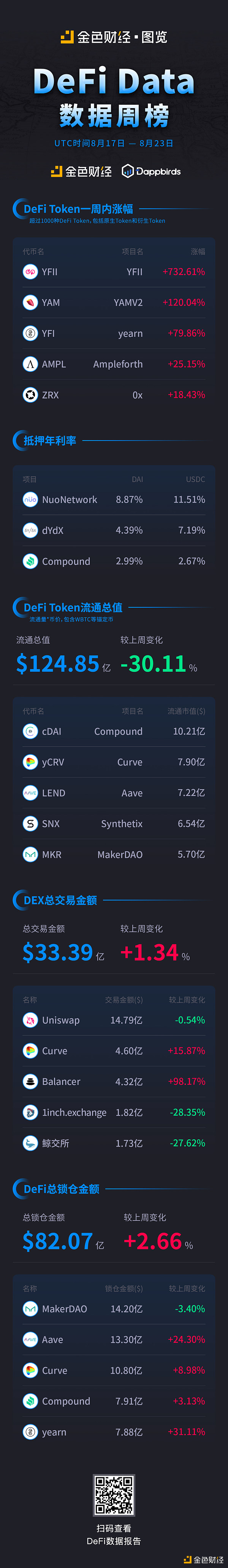 DeFi Token流通總值為124.85億美元,較上周下降了30%;但DEX總交易和DeFi總鎖倉金額未受影響,有小幅上漲。更多數據,看這張圖就夠了。