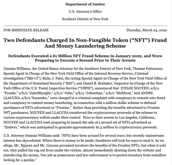 上月底,美國司法部官網披露了一起NFT涉嫌欺詐和洗錢案件,該欺詐案件采用的正是俗稱的“地毯式拉動”,即NFT項目的創建者在募資后突然放棄了項目并欺詐性地保留項目投資者的投入資產。