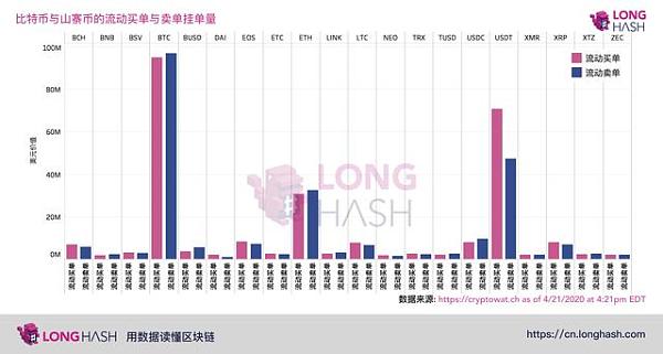 流動買單(Liquid Bids)是 Cryptowatch 定的一個指標,是該平臺追蹤到的市面上最佳出價在 100 基點內的所有買單的總和。流動賣單(Liquid Asks)也是同樣的概念。也就是說,這個數據能夠顯示訂單欄上各幣種按市價 1% 以內的價差交易的掛單量。