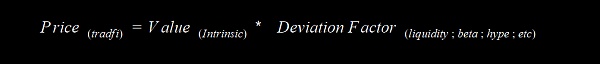 其中偏差因子(DeviationFactor,如流動性、β、市場炒作等)可能對內在價值產生正面或負面影響,從而給出當前的市場價格。