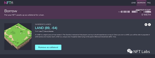 然后資產就可以發布在 NFTfi 借貸市場上,作為抵押品獲得貸款(下圖以 The Sandbox 地塊為例)。