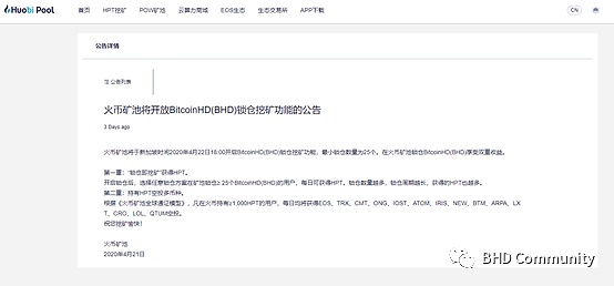(BHD上線火幣礦池公告)