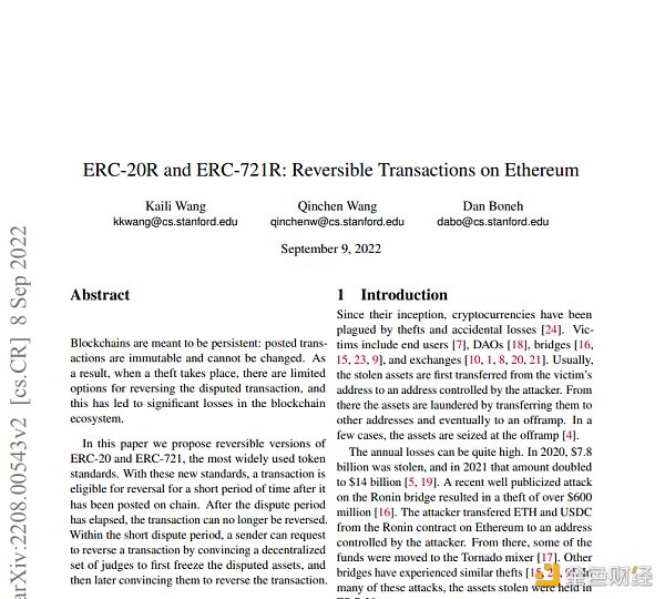 這是斯坦福大學的幾個人(Dan Boneh、Qinchen Wang和Kaili Wang)在過去幾個月里一直在努力回答的問題。我們設計了與ERC-20和ERC-721類似的可選代幣標準,并支持逆轉交易(當有足夠的證據證明值得這樣做時),寫了一篇關于它們的論文,并實現了一些原型。我們將這些代幣標準分別稱為ERC-20R和ERC-721R。