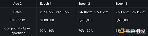 在Age2-Epoch1,Morpho將分配300萬個MORPHO代幣,其中Compound-Aave市場分配占比為90%-10%。剩余700萬代幣則分別于Epoch2、Epoch3階段分配,時間持續至今年12月29日。