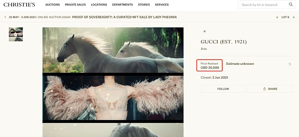 案例參考:作為第一家發布自己的 NFT 的時尚品牌Gucci,在成立百年之際推出了以Aria系列為靈感的時尚電影NFT,起拍價是2000美元,而最終成交價格達到25,000美元,是起拍價的10多倍。