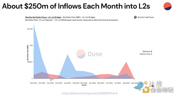 解讀:這張圖的計算方式是,算出 L1 到 L2 存入的總金額,以及 L2 到 L1 取出的總金額,兩者相減得到的差額。結果是 2.5 億美金的凈存入。接著上面那個問題,這其中是否有大量資金為了薅羊毛或者獲取其他收益?