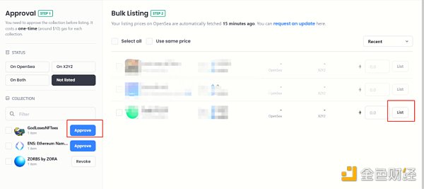用戶點擊錢包中的「Bulk Listing」即可進行 NFT 批量上架操作,批量上架分為三個部分,首先是許可授權,每個系列的 NFT 需要收取 Gas 費用,該筆費用是給礦工的;其次用戶選擇多個 NFT 填寫上架價格;最后點擊「List」上架,進行錢包簽名即可。每個系列 NFT 只需要進行許可授權一次,后期再次進行上架是不需要進行許可的。