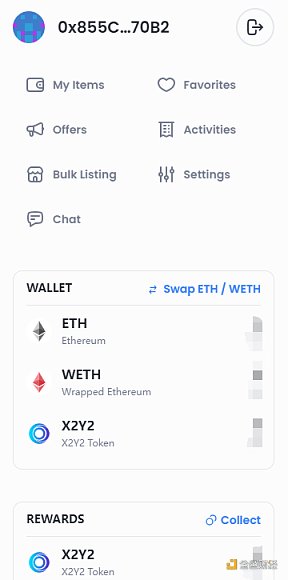用戶連接錢包后點擊錢包頭像即可看到數據面板,該面板會披露錢包中的目前的 ETH、WETH 和 X2Y2 代幣余額以及 X2Y2 代幣獎勵;最關鍵是該頁面提供了目前錢包中持有的 NFT、用戶收藏的 NFT、出價的 NFT 已經批量上的 NFT 等統計模塊,方便用戶歸類查詢,也是用戶進行部分功能的入口端。
