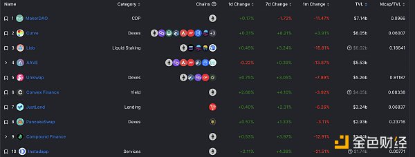 DeFi項目鎖定資產前十排名及鎖倉量 數據來源:defillama