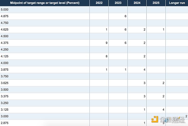 點陣圖顯示,9 名官員中有 6 名支持明年將利率升至 4.75%-5% 的范圍,但中心趨勢是 4.6%,這將使利率處于 4.5%-4.75% 的范圍內。該圖表顯示,降息或許等到2024年,官員預測在 2024 年降息多達 3 次,2025 年降息 4 次,以將長期基準利率降至 2.9% 的中值前景。