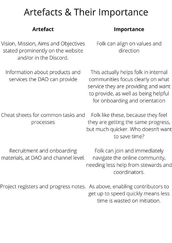 一個新的貢獻者的學習曲線可以通過自助學習材料或“人工制品”的存在而顯著提高。自我學習路徑將DAO管理員和協調員從高接觸的工作中解放出來,特別是在會議還是在聊天頻道中。