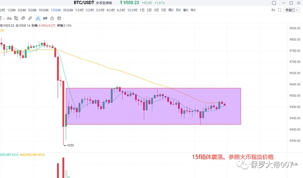 合約方面,15分鐘小級別看BTC處于“箱體震蕩”。跌破15f支撐9400短空;突破站穩9600短多(插針不算。帶50點左右止損,防止假突破。)