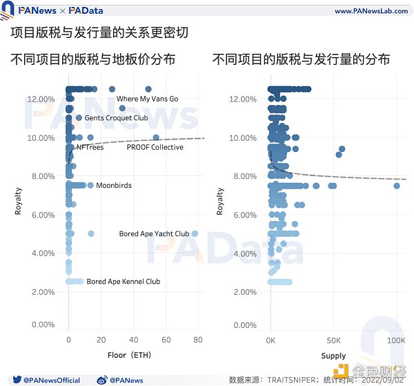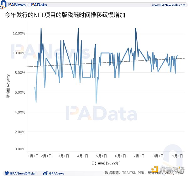 PAData抓取了TRAITSNIPER上1956個NFT項目的版稅數據,根據統計,所有項目版稅的平均值為9.06%。版稅最高的25%個項目的版稅都超過了10.50%,最高達到了12.5%,包括近期的熱門項目DigiDaigaku Genesis,還包括RTFKT-CloneX Mintvial、RTFKT x Nike Dunk Genesis CRYPTOKICKS、adidas Originals Into the Metaverse等品牌項目。版稅最低的25%個項目的版稅則都低于7.50%,最低達到了2.5%,包括知名項目Bored Ape Kennel Club和CryptoPunks等。另外,頭部的藍籌項目Bored Ape Yacht Club和Mutant Ape Yacht Club的版稅為5%;Otherdeed for Otherside、Azuki、Pudgy Penguins、Doodles、Cool Cats的版稅都為7.5%。