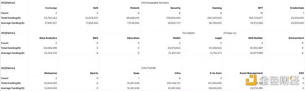 Alpha 市場的特性是在交易驅動的融資。具有 Alpha 特性的項目需要表現為同一個 Layer 的類別中明顯超越其他項目。我們在本文中尋找的 Alpha 項目,需要滿足總融資超過其所在賽道平均融資的 2 倍以上。