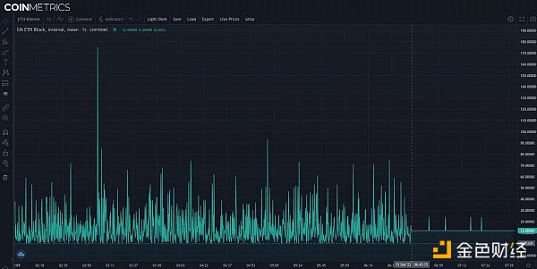 隨著權益證明機制順利運轉,我們開始看到鏈上的一些影響。下圖顯示了合并前后的時間對比。正如預期一樣,在避免了挖礦的概率性過程,區塊到達時間為更容易預測的 12 秒(除了幾個錯過的 slot)