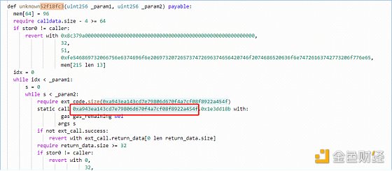 (3)從反編譯代碼中尋找這個編碼后的合約方法,可以找到這個合約攻擊的項目方合約地址,也就是 Uranium 項目所在的地址:0xa943ea143cd7e79806d670f4a7cf08f8922a454f