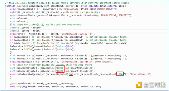 (4)通過分析,Uranium 項目合約中的漏洞出現在 UraniumPair.sol 合約中的 swap 函數中,這個漏洞會導致任何人可以隨意的轉出合約中的數字資產,而只需要付出一點點的代價。可以看到 swap 中,最后是一個10的8次方數和一個10的6次方數的比較,這是一個幾乎是恒等的判斷,這就意味著只要按照一定的套路不斷的執行 swap 函數,就可以清空這個合約中所有的數字資產。